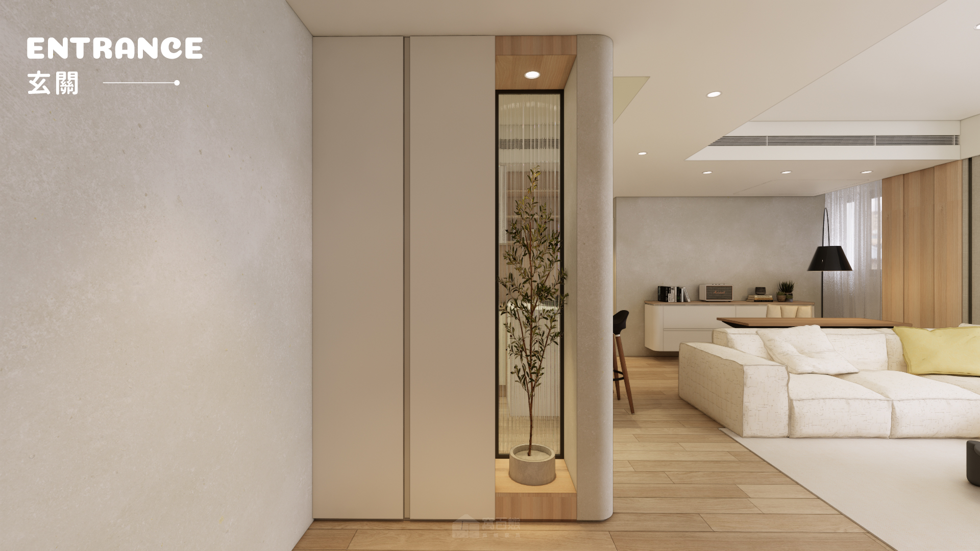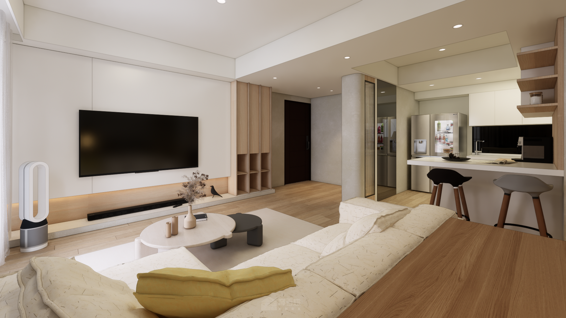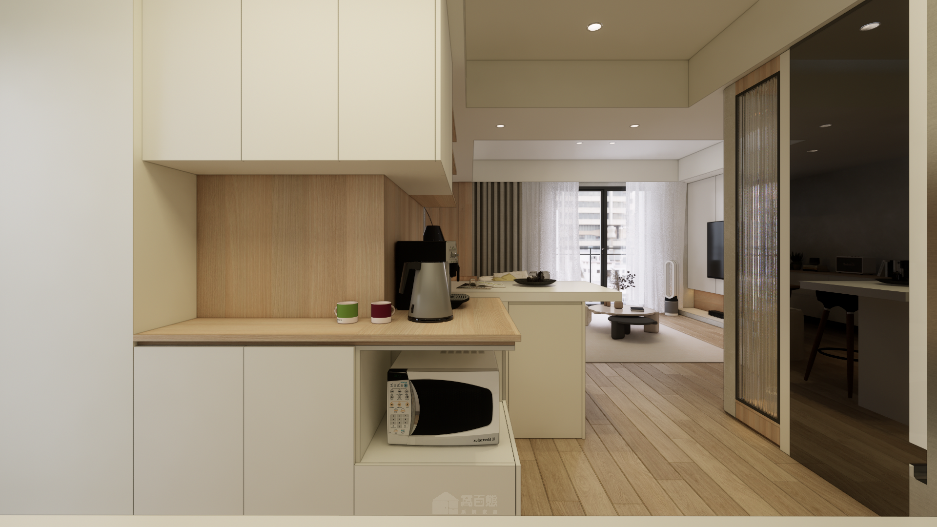 以淺色原木板材為底,搭配純白門片,透過開放式書房與隱形式收納設計,讓視野更加開闊,打造充滿療癒感的居家場所。