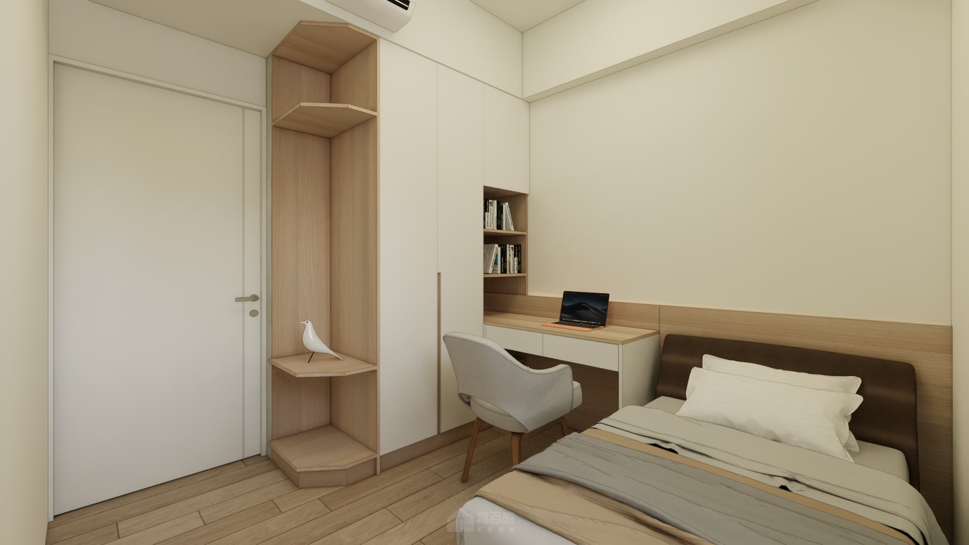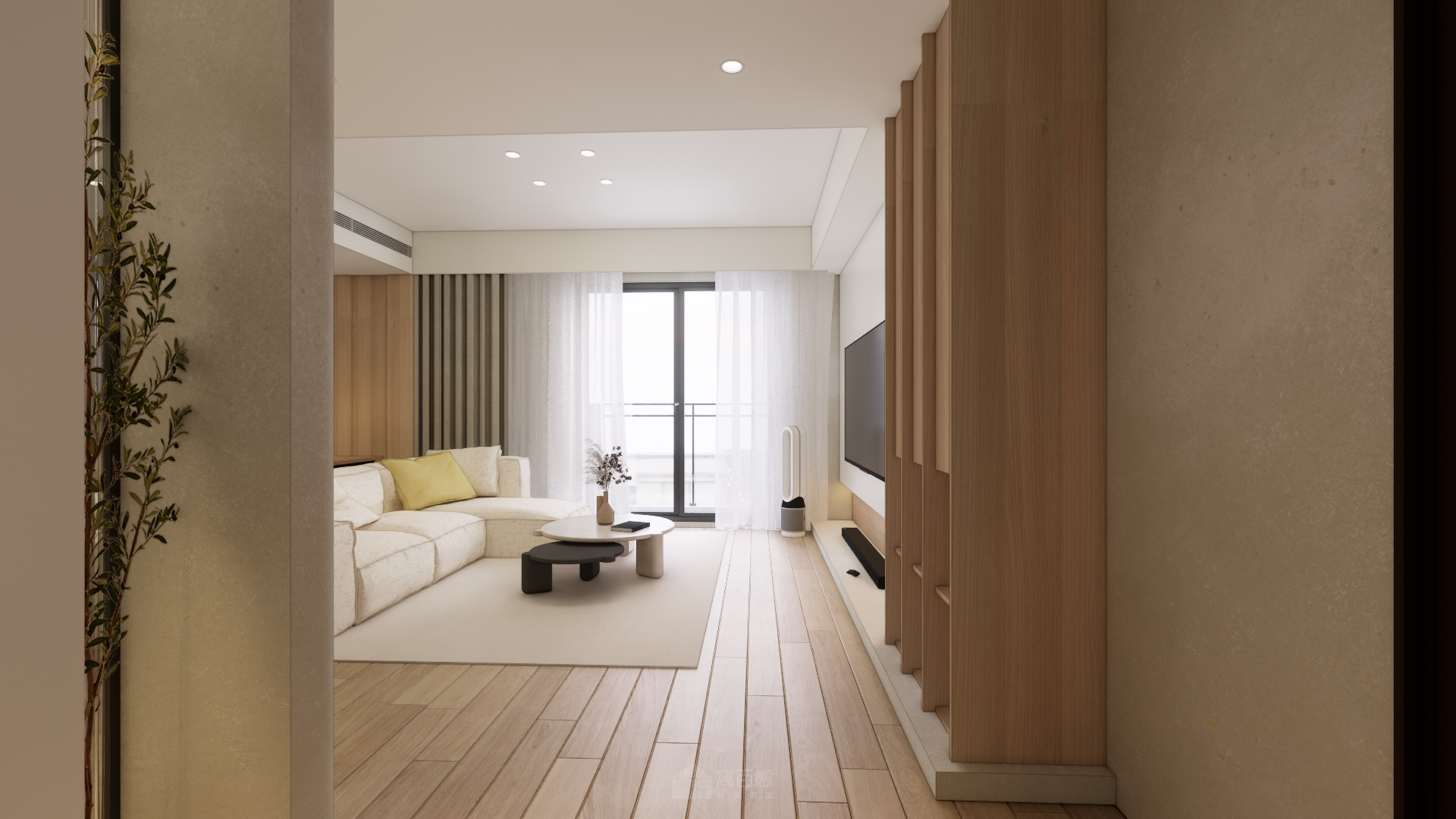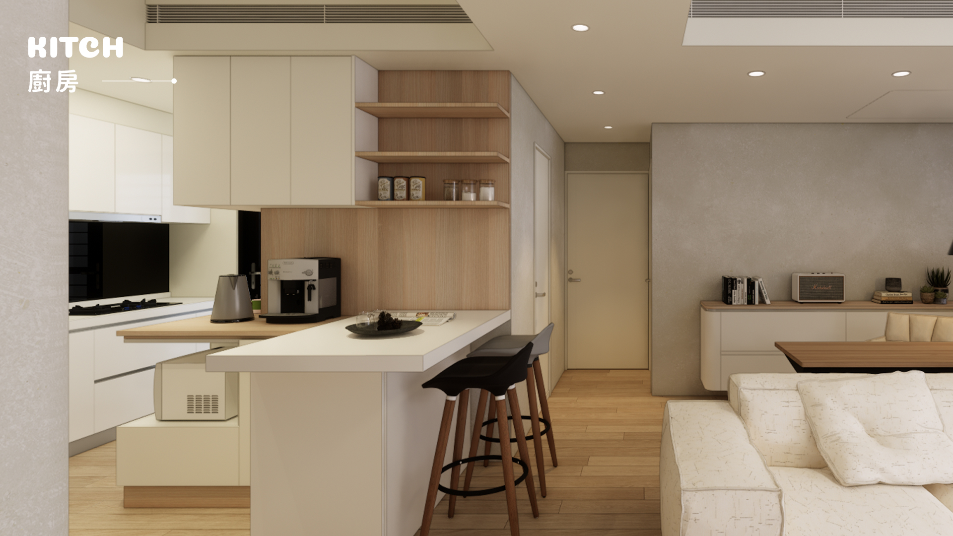 以淺色原木板材為底,搭配純白門片,透過開放式書房與隱形式收納設計,讓視野更加開闊,打造充滿療癒感的居家場所。