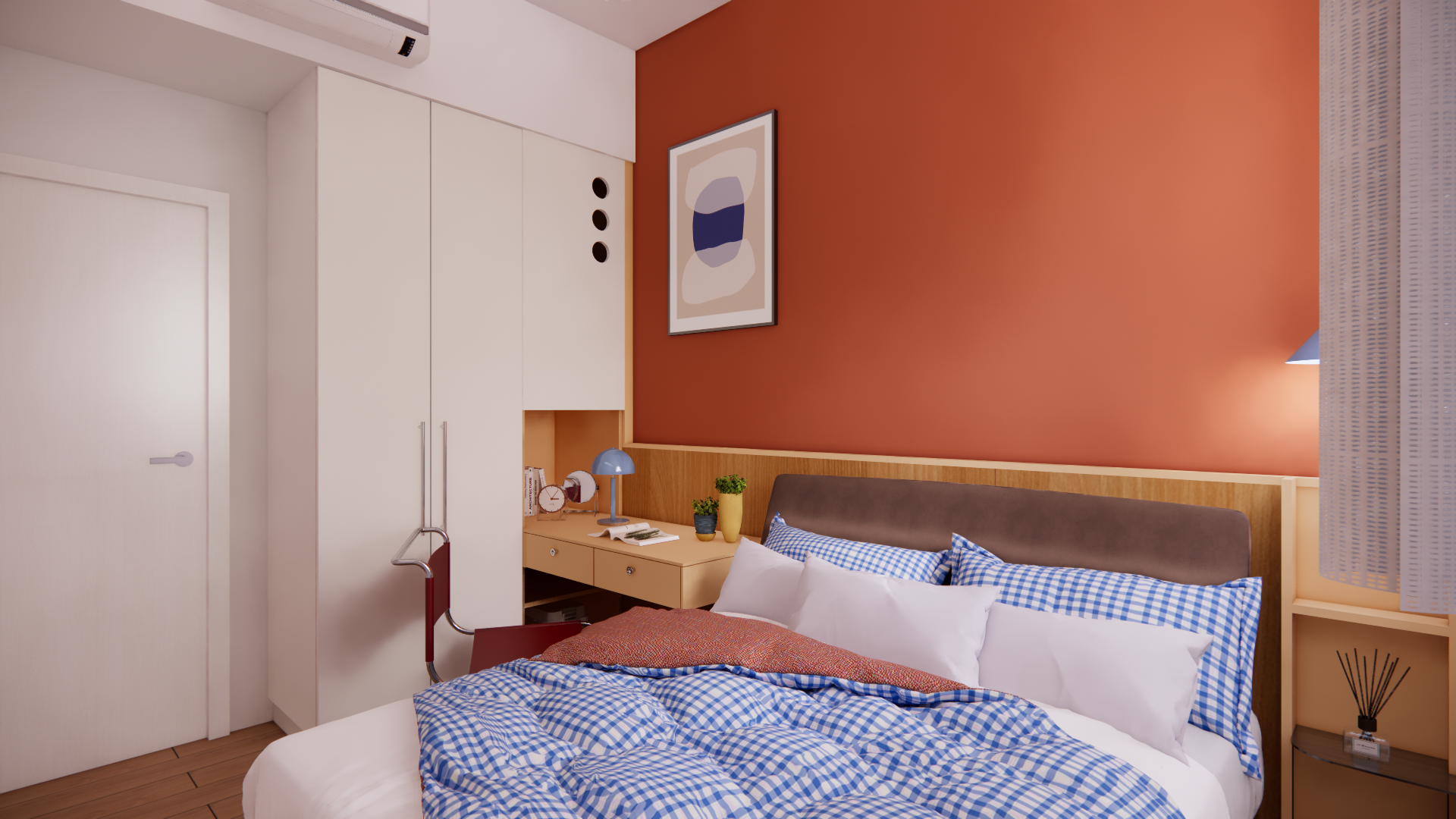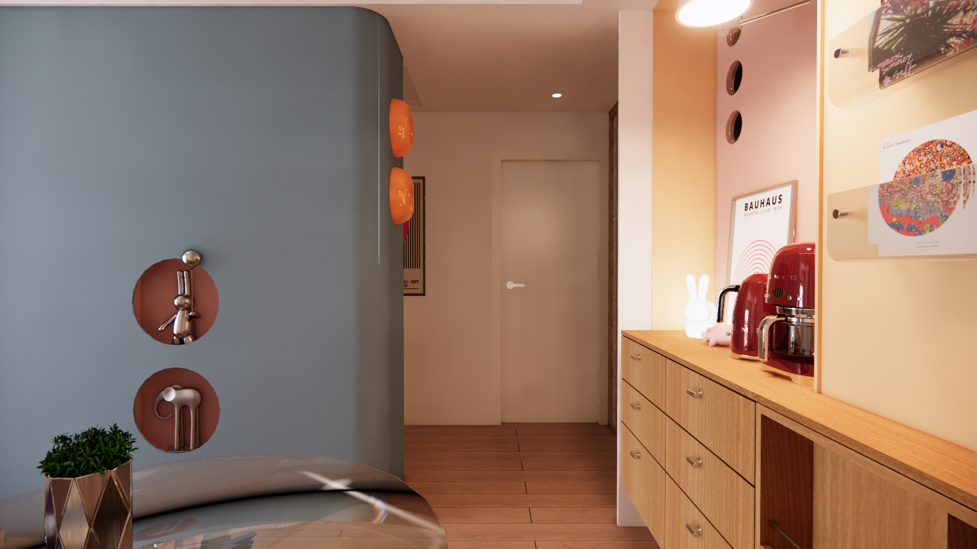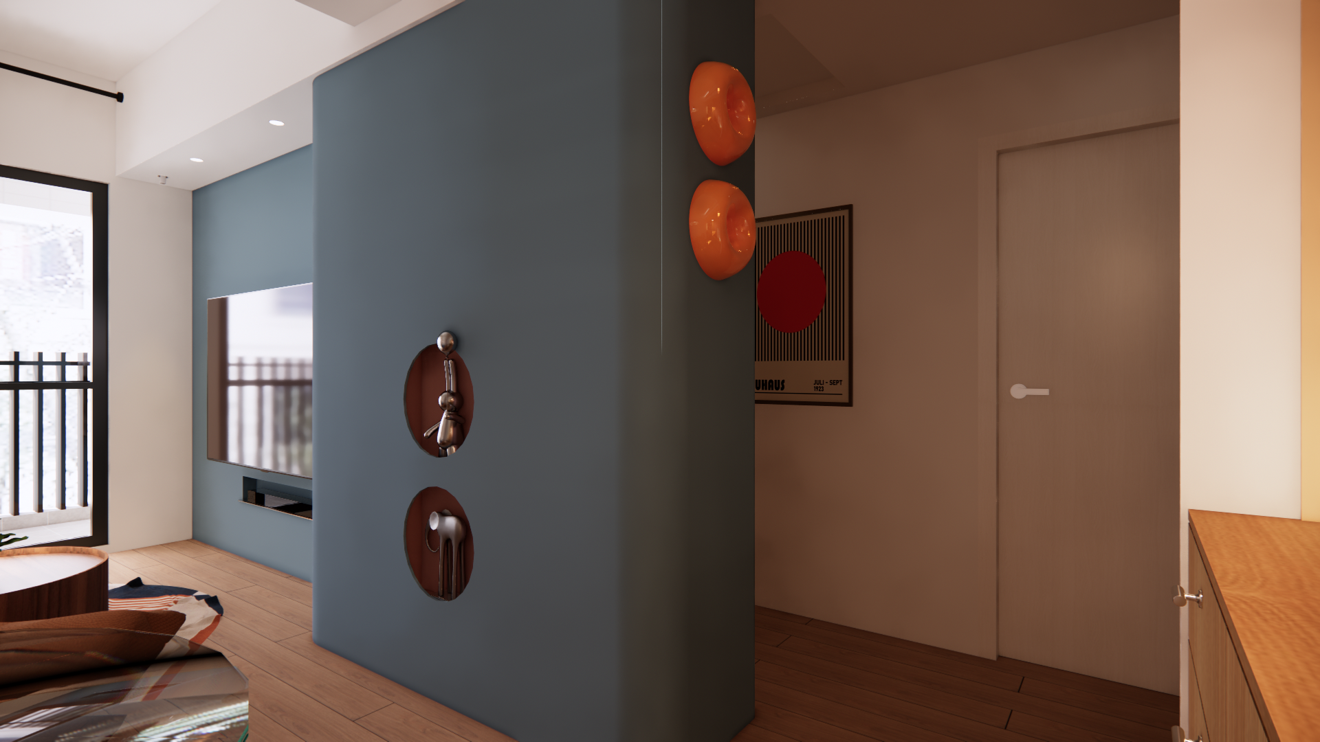 以原木色奠定自然質感,搭配幾何圖形與大膽撞色,打造極具辨識度的藝術居家風格。