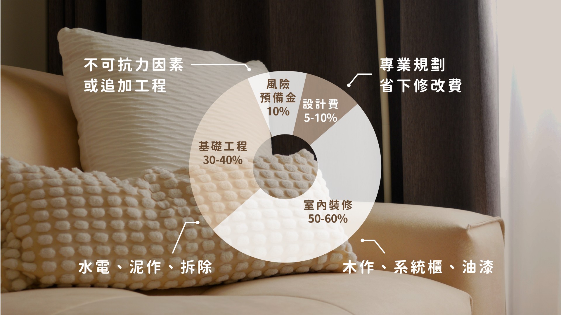 | 裝修工程 | 50%–60% | 包含木作、漆料、燈具、系統櫃、廚具、地板及天花板等視覺與收納機能配置 |