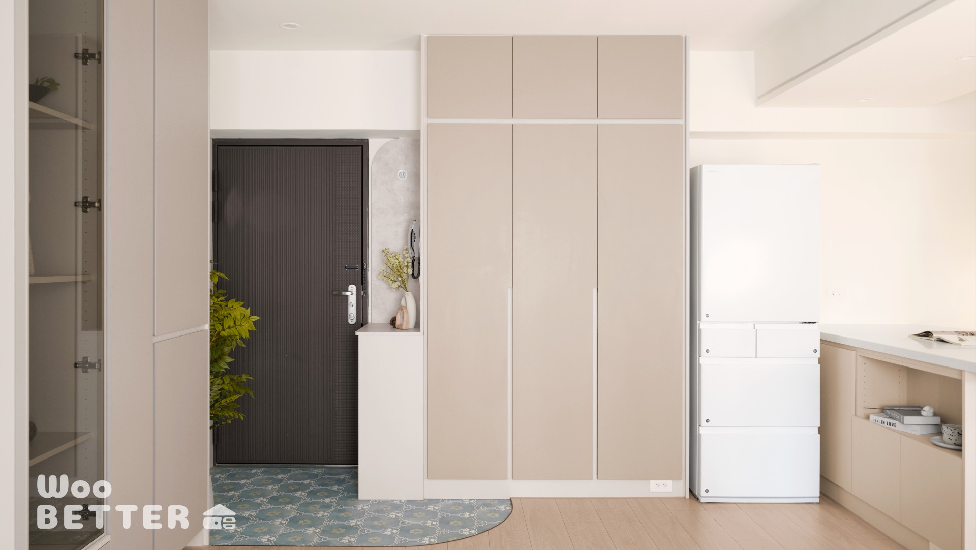 1.將原本壓迫的入口高櫃改為低矮平台櫃,並在大門側邊定制琺瑯板,整合記事與磁吸功能。
