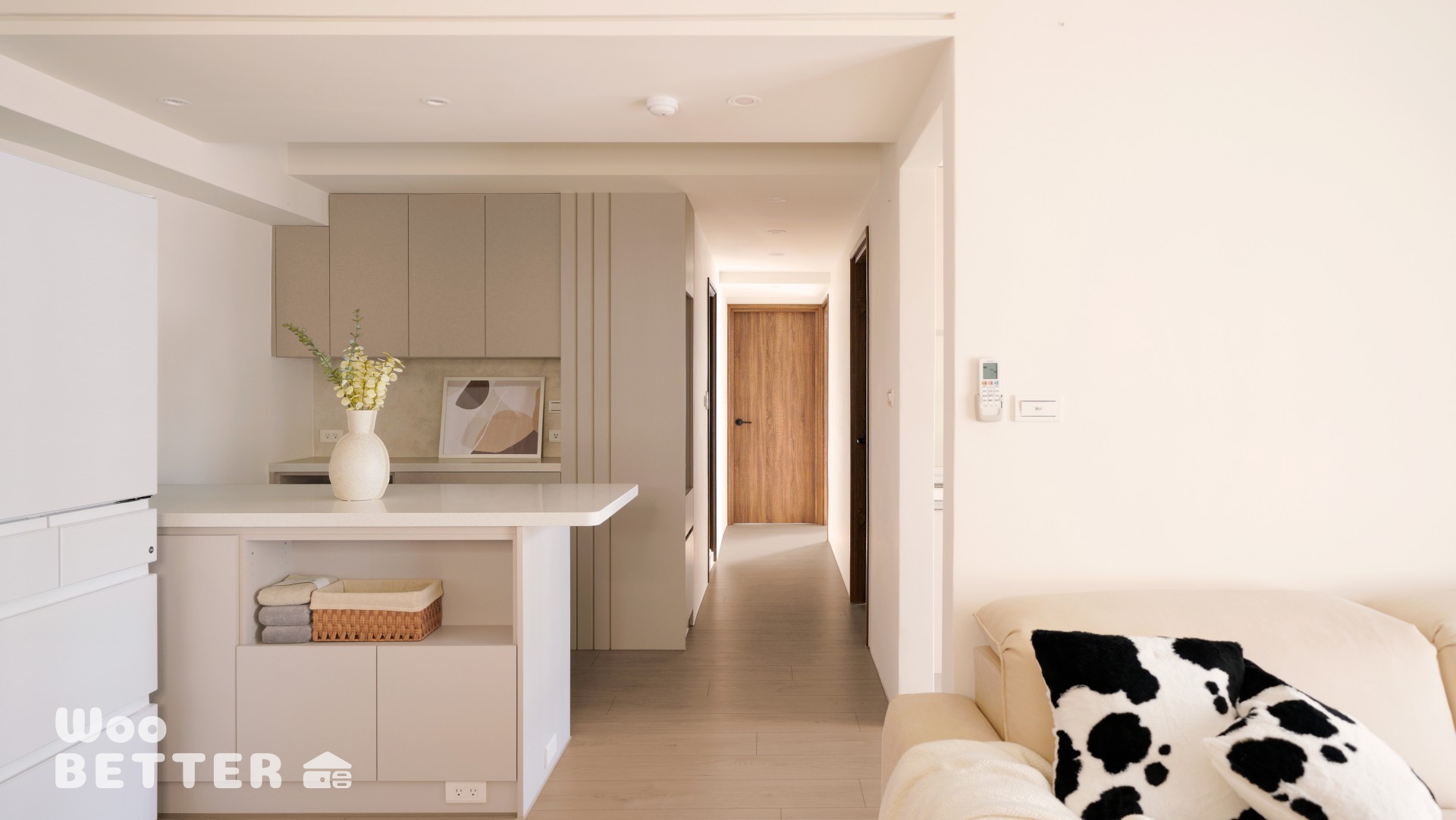 全室以溫潤的米灰木紋與可可色系為基調,局部點綴復古元素(如:玄關藍調六角磚、衛浴復古綠色長條磚),並透過茶色玻璃與金屬刷漆飾板的細節堆疊,在現代簡約中注入優雅的懷舊情調。