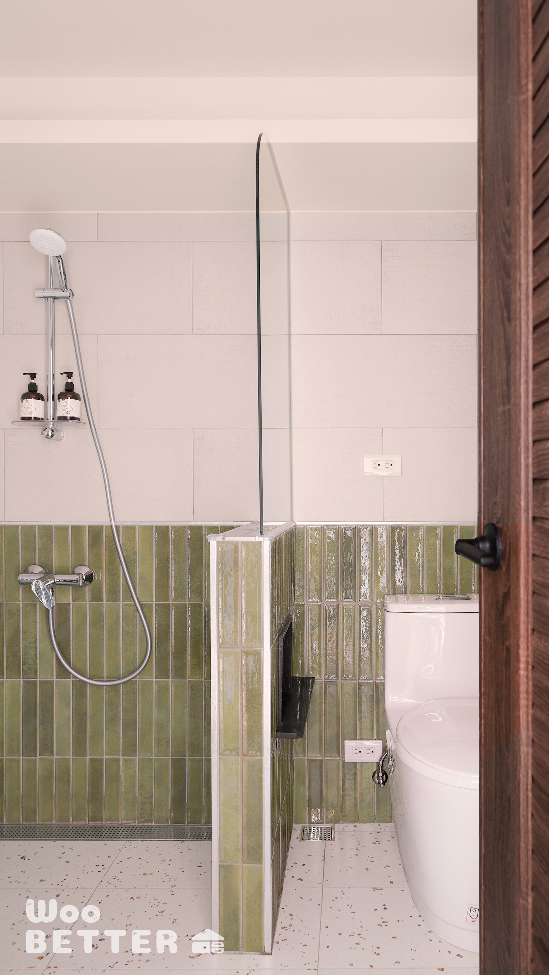 2.衛浴採用半矮牆搭配圓弧玻璃,實現乾濕分離並維持通透感。
