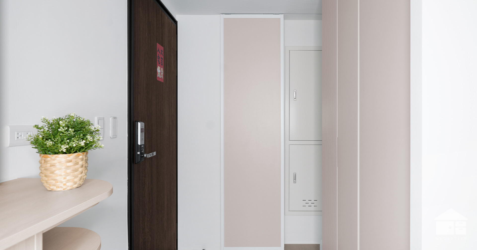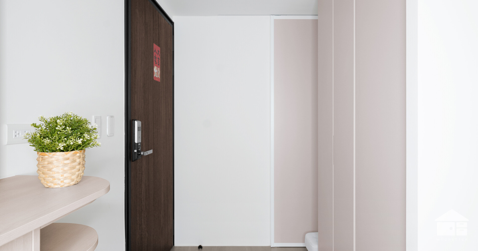 ・玄關|櫃體旁搭配一面長虹玻璃,讓光線得以透進玄關