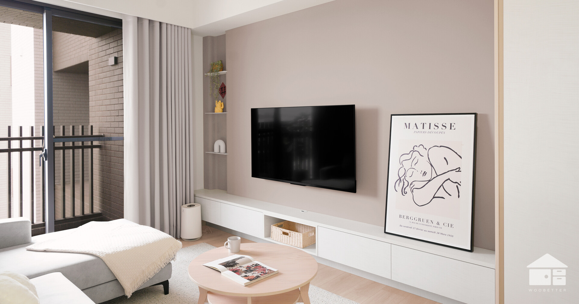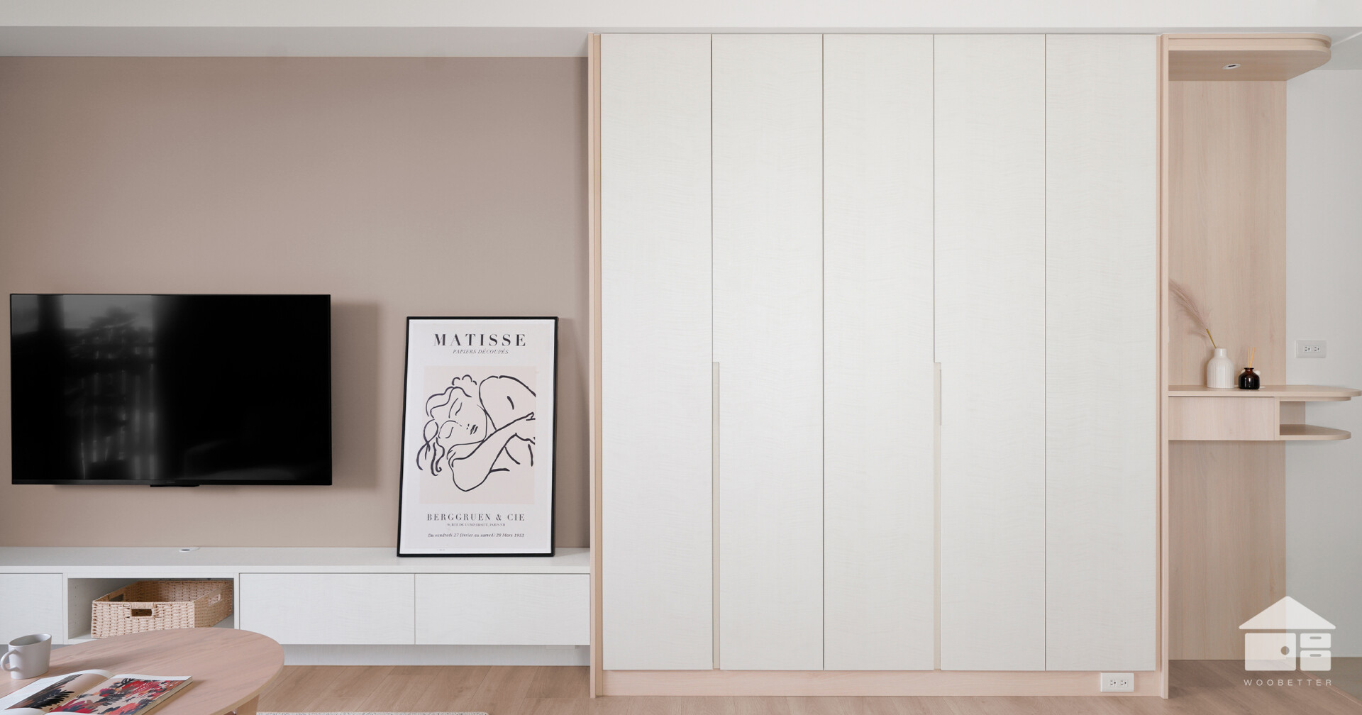 ▼客廳以輕淺的米白色與溫潤木質為基底,並以細膩的線條勾勒出空間的層次。設計師沒讓系統櫃占滿整個牆面,而是特意留下一處「空白」,將收納與展示巧妙結合。
