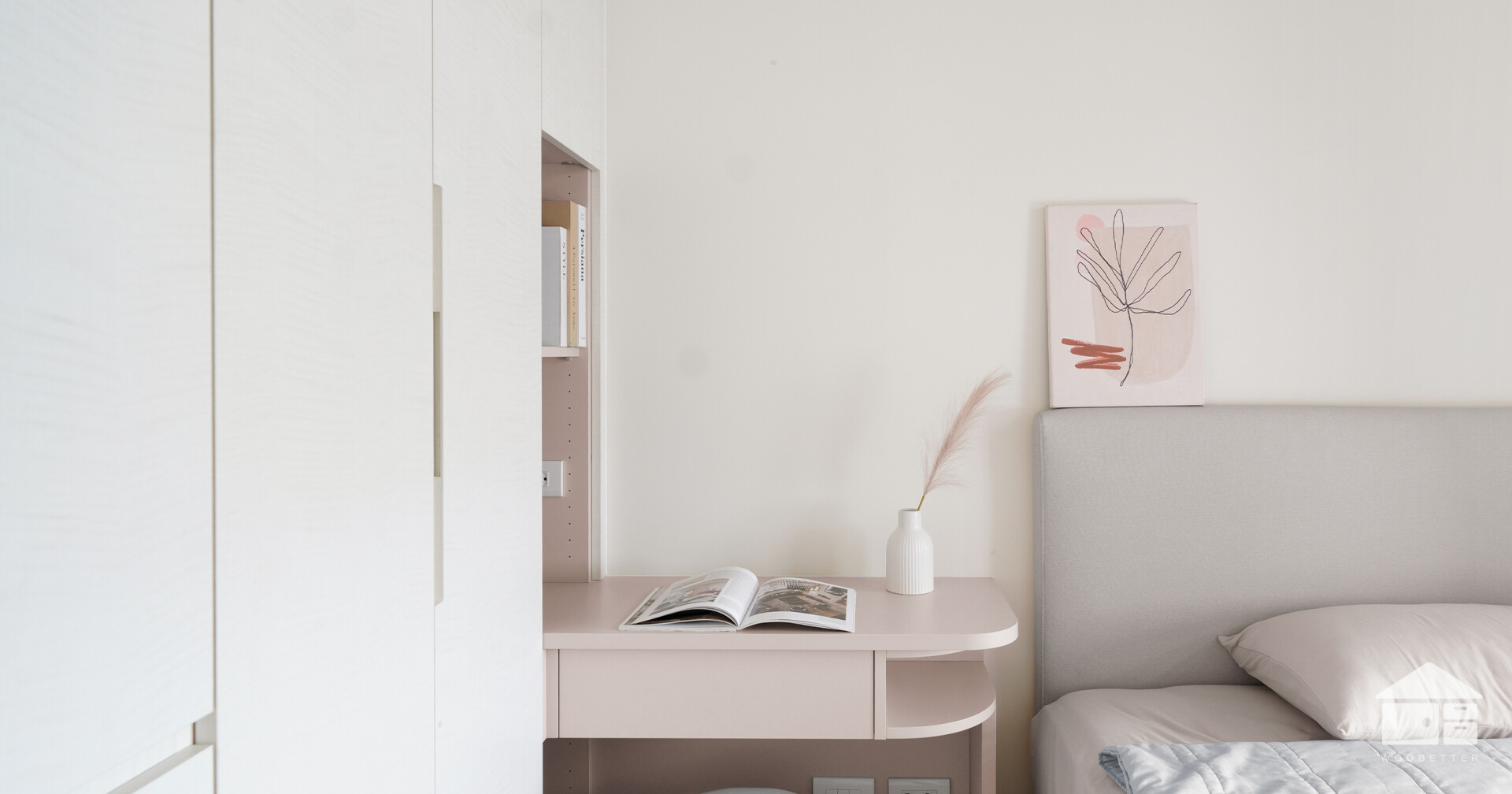 臥室化妝台,以優雅的圓弧取代銳利直角,柔化了空間的線條。