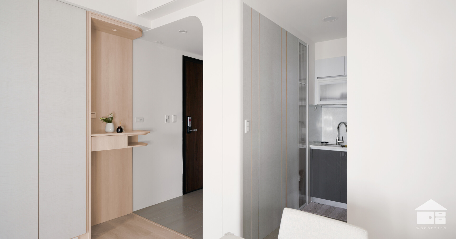 房屋原本的格局是開門直接見廚房,為了解決這個問題並增加收納機能,設計師用系統櫃劃分出獨立的玄關區域