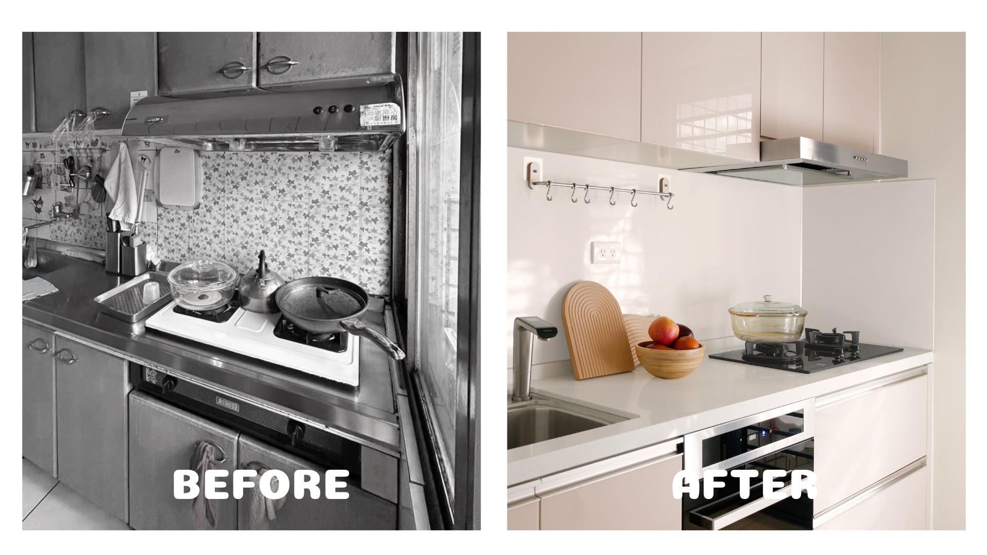 考量到爐具旁的舊窗戶不好清潔,所以設計師將原本的窗戶封閉,並改貼耐髒且易於清理的琺瑯板,讓廚房的維護更加輕鬆。通往陽台的門也改換為實用的三合一門,讓通風與採光更具彈性。