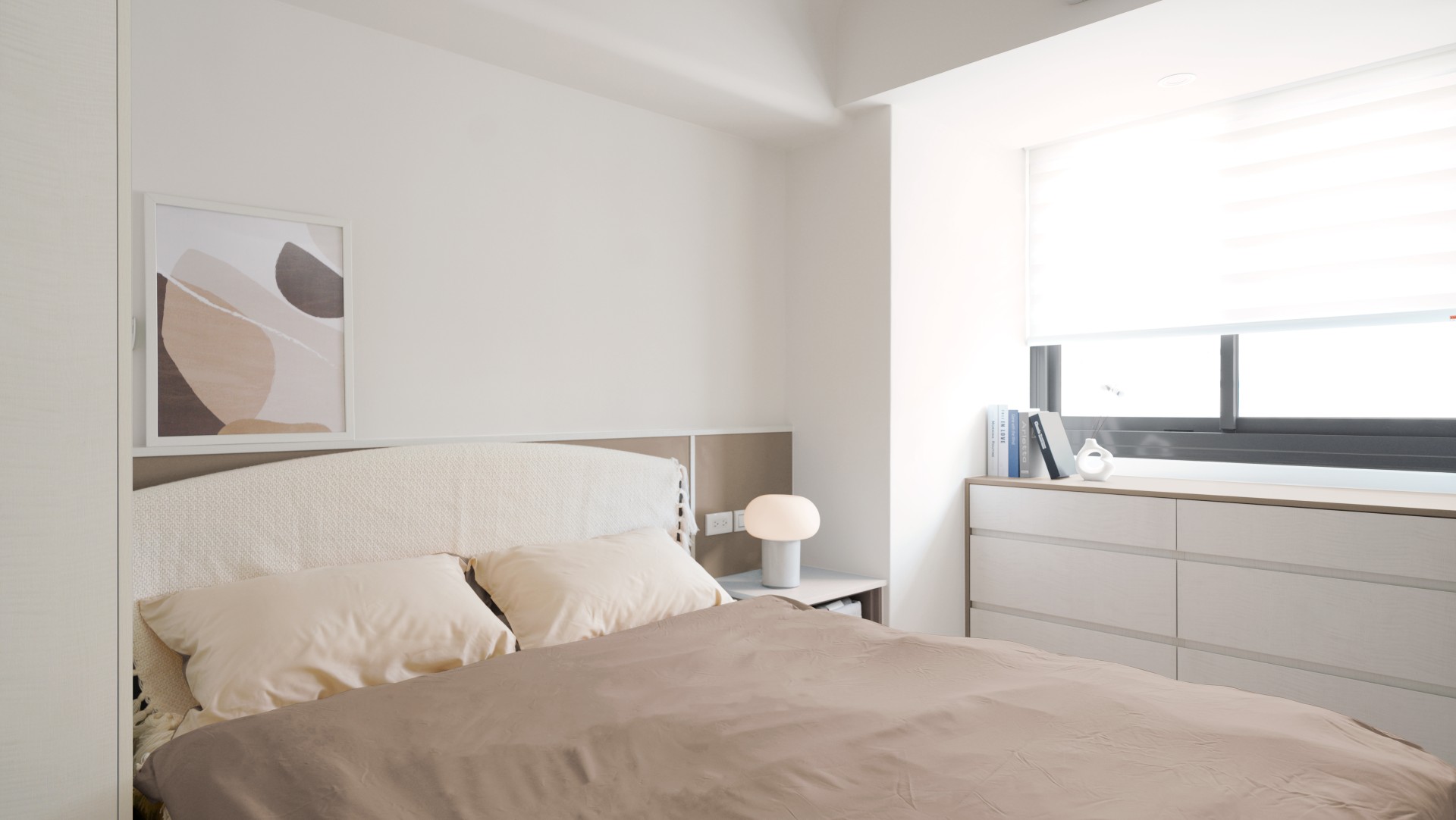 房內沒有設置梳妝台,而是根據屋主的使用習慣,在窗戶下方的畸零空間處設計了實用且貼合空間的斗櫃。