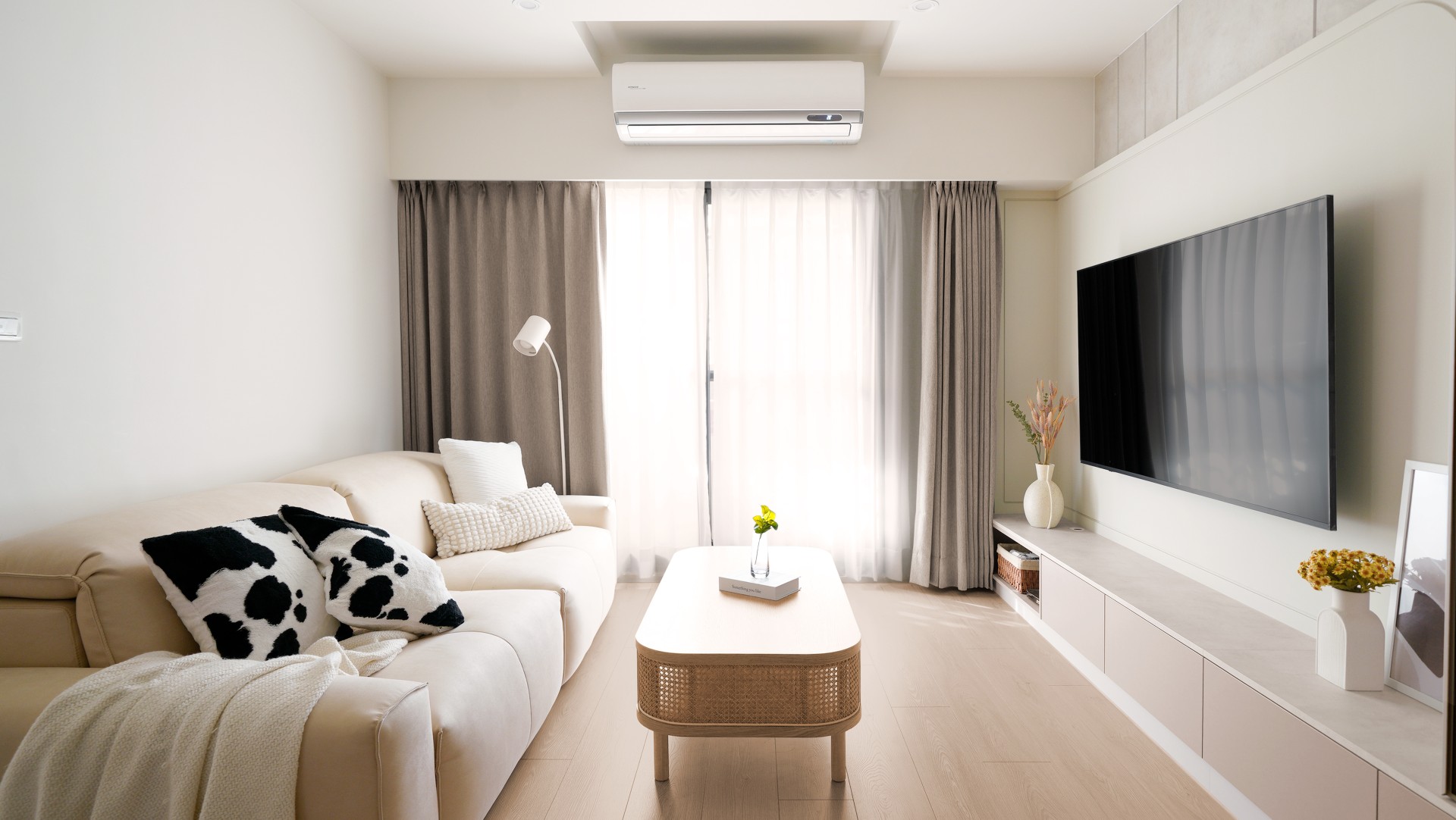為維持電視主牆的完整性,冷氣移設至落地窗側並以窗簾盒隱藏管線;窗邊配置雙層窗簾,在調節採光的同時,也有效遮蔽陽台雜物,保持視野清爽。