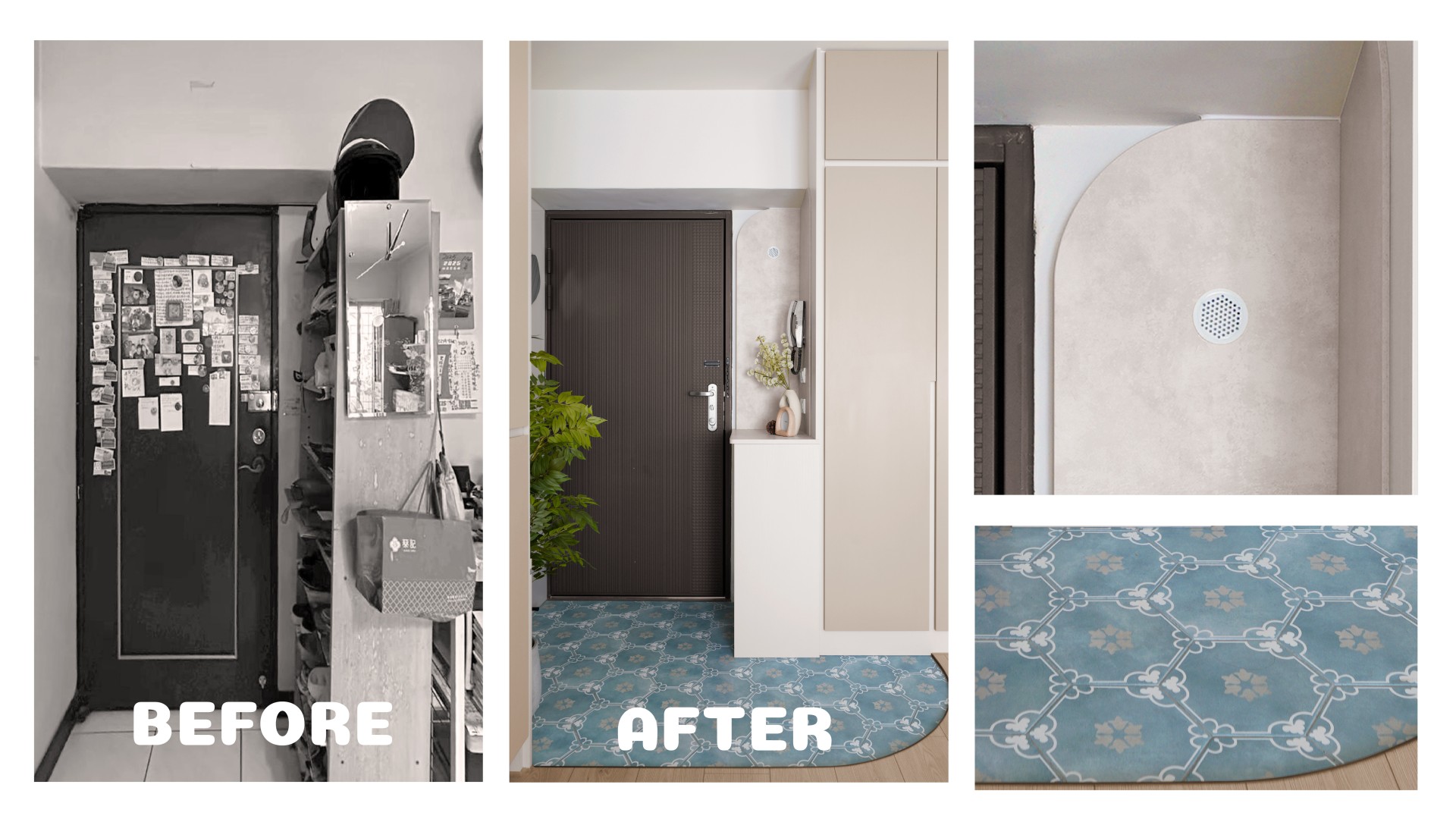 原本入口處的高聳鞋櫃,不僅容易造成視覺壓迫,也因高度和非固定性設計,存在安全疑慮。所以設計師將其改為低矮的平臺櫃,讓玄關視覺更顯輕盈開闊。