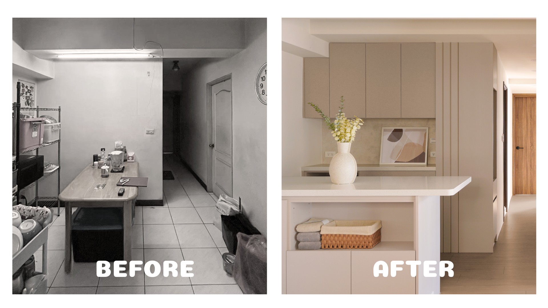 設計師將此處重新規劃為兼具儲物與社交功能的輕食及用餐區。