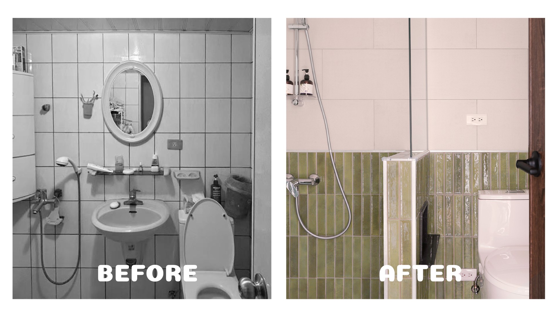 牆面下半部鋪貼帶有復古氣息的綠色長條磚,其餘壁面、地坪與天花以淺色留白,讓視覺焦點更集中,也維持整體的清爽感。
