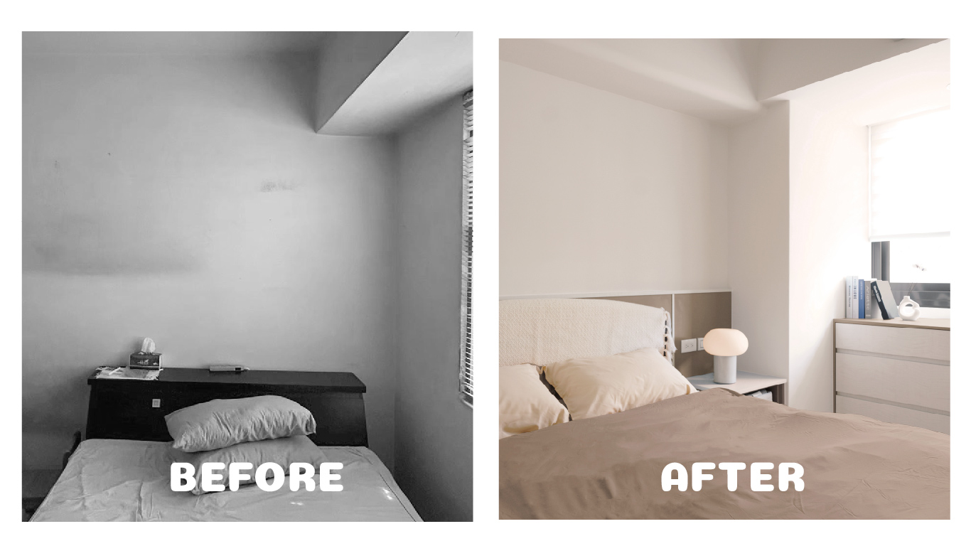 為了解決床鋪上方的大樑帶來的壓迫感,設計師運用弧形包樑,以柔和的線條取代銳利的稜角,創造出安穩舒適的睡眠環境。
